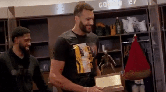 戈贝尔荣获DPOY年度大奖,爵士全队在更衣室为他疯狂庆祝,有些队友泼水庆祝;爵士队专门布置了一番,恭喜戈贝尔再次获奖;本赛季,戈贝尔为爵士出战71场常规赛,场均拿到14.3分13.5篮板1.3助攻2.7盖帽,帮助爵士获得联盟第一的战绩。