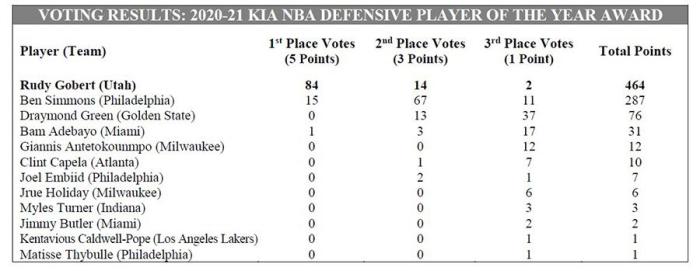 从DPOY投票结果来看,戈贝尔获得84张第一选票、14张第二选票和2张第三选票,总共获得464分;西蒙斯15张第一选票总共获得287分,勇士球星格林76人,热火球员阿德巴约获得一张第一选票,总共31分;雄鹿球星字母哥12分排在第五位。