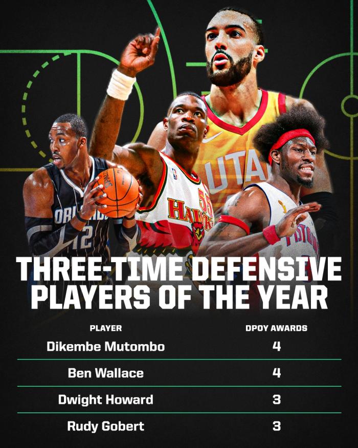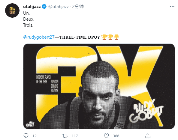 爵士官方第一时间恭喜戈贝尔获得年度最佳防守球员,据统计,这是戈贝尔生涯第三次获得DPOY,比肩穆托姆博、本-华莱士和霍华德成为历史第四位至少3次获得DPOY的球员。