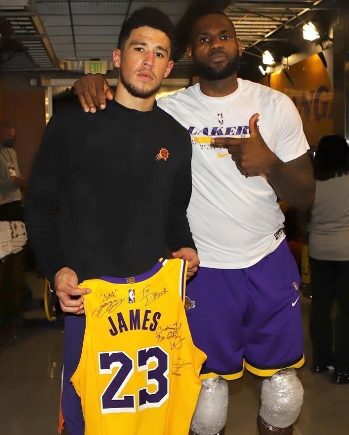 詹姆斯宣布改号码,这也让布克得到的球衣价值倍增 ,为什么呢?布克所获得的球衣大概率会成为詹姆斯在湖人队最后一件比赛中穿过的23号球衣,而且还有亲笔签名。