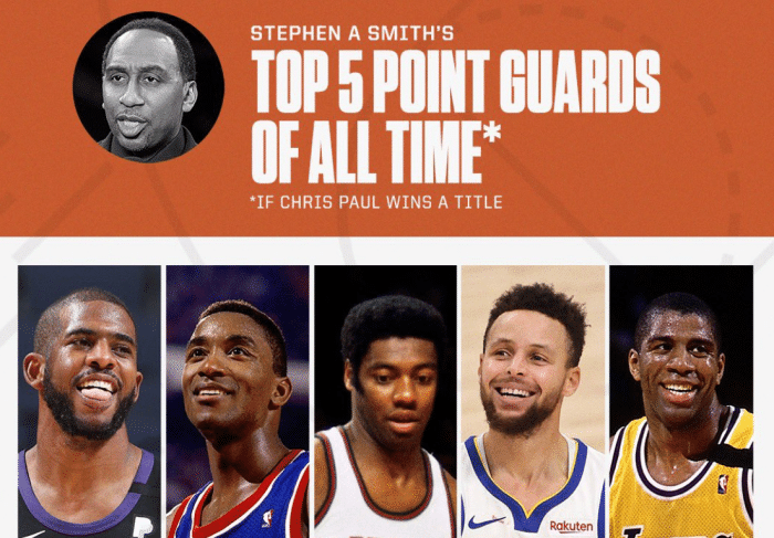 JRS直播网讯 北京时间6月9日,美国著名篮球评论员斯蒂芬A史密斯今天在社媒上晒出了自己心目中的历史五大控卫!