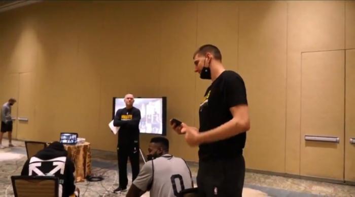 目前掘金队正在开球队会议时收到了来自NBA官方的视频,NBA总裁萧华宣布约基奇当选本赛季常规赛MVP。约基奇在更衣室内喊话“当然,这是一个个人荣誉,但没有你们,我做不到的。这可能是我的荣誉,我的奖杯,但你们也是很重要的一部分,谢谢,谢谢你们所有人。”