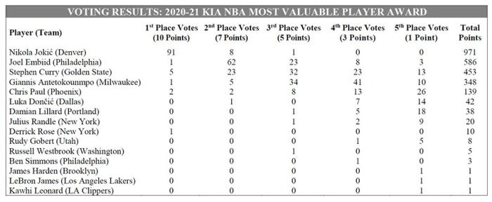 NBA官方随后也公布了各大候选人得票情况,排在第二位的恩比德获得了586分,库里第三453分,老詹排在第十四位仅获得一张第五选票,但是这不妨碍他的伟大。据统计他连续18个赛季有MVP选票,生涯4次当选,真是不老常青树,下赛季就将37岁的他会继续带领湖人夺冠吗?