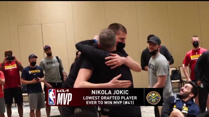 通过视频连线的方式,联盟总裁亲自宣布约基奇获得MVP,随后掘金全队都为约基奇而鼓掌庆祝,约基奇拥抱主教练马龙并且发表获奖感言:这是一个个人荣誉,但没有你们,我是做不到的,谢谢你们所有人!