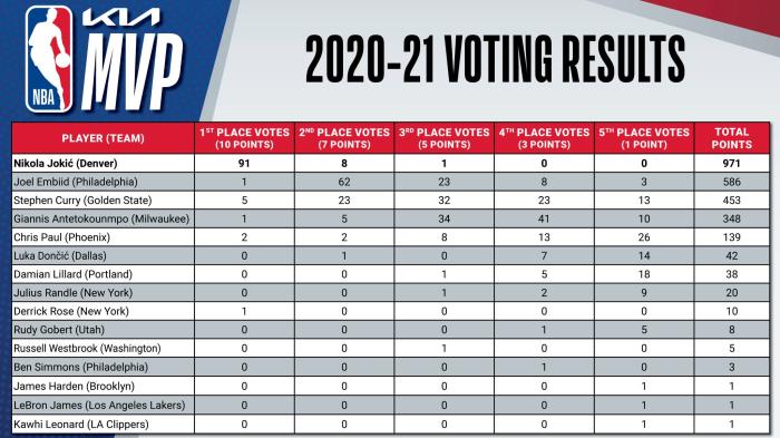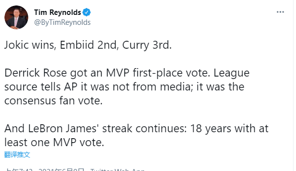 约基奇创造历史,成为史上选秀顺位最低的MVP得主;不过MVP票选结果公布后,尼克斯球员德里克-罗斯获得一张第一选票引热议。