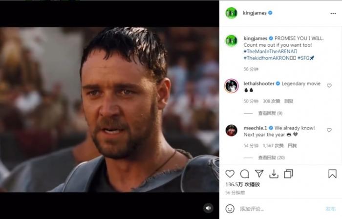 新的MVP出炉,老的MVP也不愿意就这样老去,在看到杜兰特疯狂的表现后,詹姆斯在社交媒体上为阿杜打CALL,或许是看球看的热血沸腾,詹姆斯在社交媒体上转发了一段电影《角斗士》的片段并且配文:我将会复仇,无论是今生还是来世。詹姆斯还强调:向你们保证我会做到的,如果你想把我排除在外的话,尽管这样做吧。