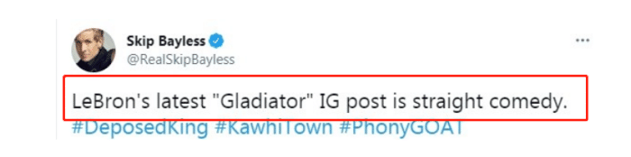 詹姆斯发表这条动态,也是为了表达自己的心志,鼓励自己。然而,又有人黑他了。对不起詹姆斯,你已经被盯上了,最大詹黑Skip时刻关注詹姆斯的一举一动,詹姆斯前脚刚发完社媒,Skip马上就来吐槽他。