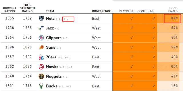 似乎雄鹿没怎么抵抗就倒下了,赛后数据网站第一时间更新了篮网的晋级概率,目前已经从G1后的69%上升到了84%!甚至各路名嘴以及球迷看好篮网4:0横扫对手晋级,当然了现在系列赛还没结束,篮网还不能大意,要知道独行侠就是在2:0情况下被翻盘的!