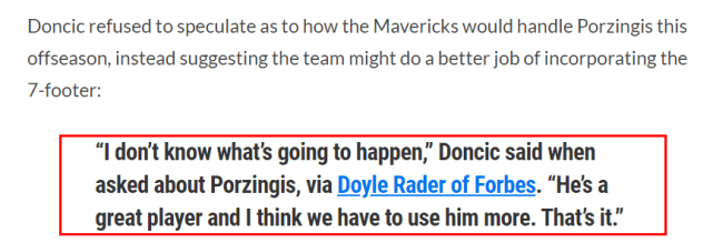 显然,东契奇应该感受到了波尔津吉斯的不满。美媒大都认为两人不合适,clutchpoints已经为东契奇推荐了四位新搭档,认为他们比波津更适合东契奇。