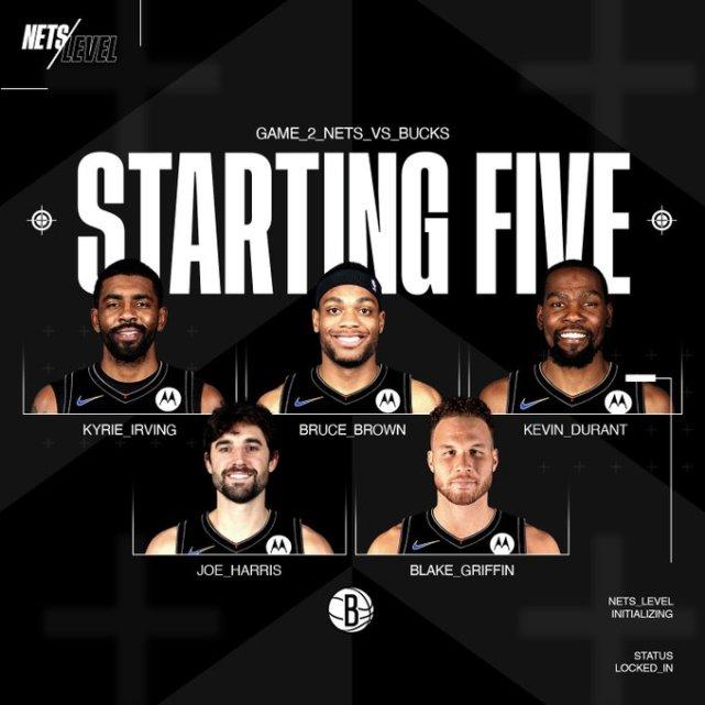 对阵雄鹿的第二场比赛,纳什宣布布鲁斯-布朗顶替受伤的哈登,搭档杜兰特、欧文、乔-哈里斯和格里芬一起首发。