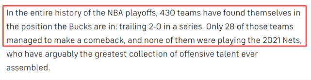 从概率上看,雄鹿当然还有希望,但CBS体育也泼了一盆冷水:“翻盘成功的那28支球队,没有一支的对手是2021年的篮网,一支可能集合了史上最强进攻天才的球队。”设想一下,如果今年快船的对手不是独行侠,而是篮网,他们还能在0-2落后的情况下翻盘吗?