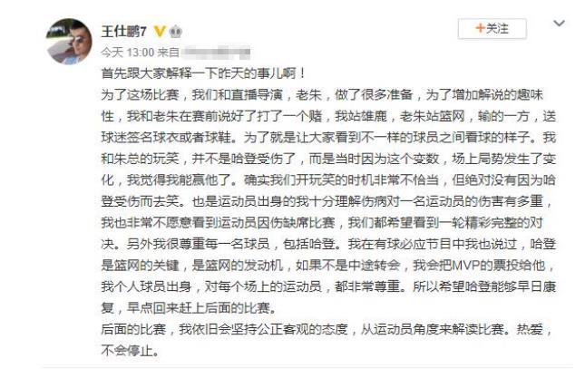 王仕鹏强调,他和朱芳雨的玩笑并不是因为哈登受伤了,而是当时因为这个变数,场上局势发生了变化,他觉得可以赢了朱芳雨。王仕鹏也在社交媒体上道歉承认,这个玩笑的时机非常的不合时宜,他也再一次强调自己理解伤痛对于运动员的伤害,并祝福哈登重新返回赛场。