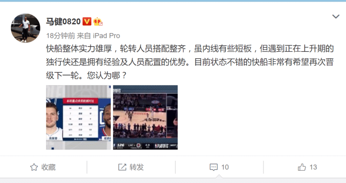 而前国手马健老师也认为目前状态不错的快船非常有希望再次晋级下一轮!