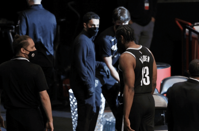 在此前一天篮网和雄鹿的比赛中,哈登开场43秒便出现腿筋拉伤离场。随后,负责结束本场比赛的王仕鹏,不合时宜地发出了笑声,并且和朱芳雨开玩笑:“我们都知道哈登是篮网的发动机,朱总说两句了吧,不要紧张啦,来吧,这个你还怎么说,哈哈哈,看没看到,气势如虹了今天!”
