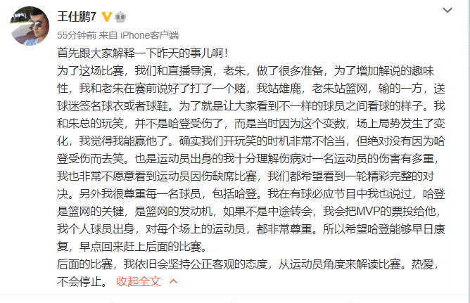 JRS直播网讯 北京时间6月7日,前男篮国手现在作为篮球评论员的王仕鹏,在社交媒体上发布动态。他对此前一天哈登受伤时他哈哈大笑一事,做了长篇幅的澄清。王仕鹏表示,之所以当时哈哈大笑,并不是因为哈登受伤了,而只是和朱芳雨的一个玩笑话。王仕鹏也承认玩笑时间点不恰当。最后,王仕鹏表示希望哈登早日康复重返赛场。