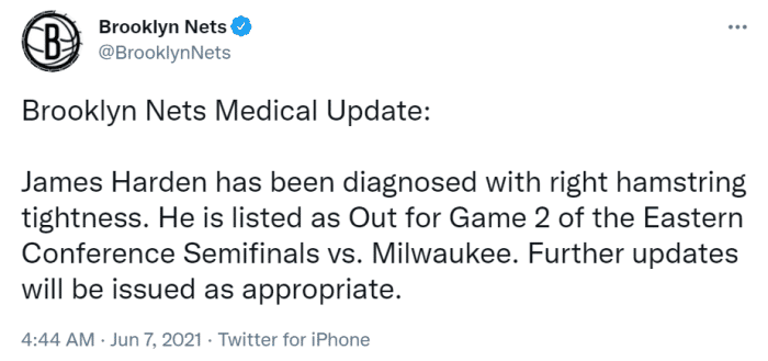 JRS直播网讯 北京时间6月7日,篮网安排了球队训练,备战对雄鹿的第二场比赛。官方也第一时间更新了哈登的伤情:右腿筋紧张。他已经确定无缘出战对阵雄鹿的第二场比赛。
