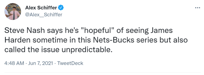 在篮网和雄鹿的东部半决赛首战中,哈登只打了43秒就因伤退场,随后篮网官方宣布哈登右腿筋受伤,本场不会回归。退出比赛后,哈登第一时间离开球馆,去接受核磁共振检查。现在,篮网官方更新伤情,哈登确定不会打G2了。纳什表示,他希望哈登能在这轮系列赛的某个时刻复出。