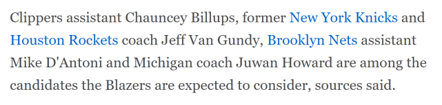 消息人士表示,开拓者还没得到与任何潜在候选人交谈或者接触的许可,但预计季后赛首轮结束后,情况将有所改变。目前,开拓者主帅的四大候选人已经浮出水面,他们分别是快船助教比卢普斯、前尼克斯和火箭主帅小范甘迪、篮网助教德安东尼和密歇根大学主帅朱旺-霍华德。