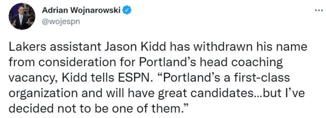 JRS直播网讯 北京时间6月7日,据ESPN报道,洛杉矶湖人队助教杰森-基德宣布自己已退出开拓者新主帅位置的竞争。“波特兰是一支一流的球队,他们将拥有出色的主教练候选人,但我决定不成为其中之一,”基德说道,“无论他们选择谁来填补特里(斯托茨)留下的空缺。”