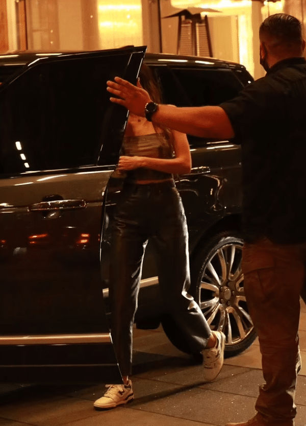 25岁詹娜身穿白色运动鞋、黑色皮裤和性感的吊带上衣,挎着一款绿色包包;安慰布克之后,詹娜在保镖的护送下,坐上一辆越野车并离开了酒店。