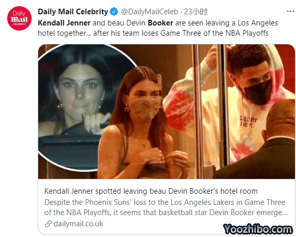 据美媒透露太阳G3输给湖人赛后,距离比赛结束大概过了45分钟,布克身穿一套黑色西装,一件白色衬衫和一双闪亮的黑色皮鞋,回到酒店后他第一时间走回房间,去见自己的女朋友,两人在房间里独处了一段时间;送走詹娜时,布克换了一件舒适的服装,扎染卫衣和灰色运动裤,卫衣是瓦妮莎推出的纪念Gigi的连帽卫衣。
