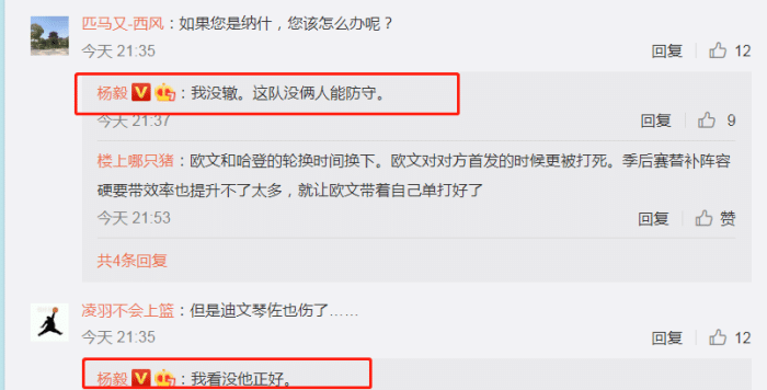 在和球迷的互动中,杨毅也连续发表看法,他认为篮网没几个人能防守,虽然雄鹿队的迪文芩佐也受伤了,但在杨毅老师看来,迪文芩佐缺席对雄鹿队影响不是那么大。