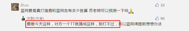 有网友让苏群老师预测一下篮网和雄鹿的半决赛,而苏群则回应称,篮网要是连特里斯坦汤普森都搞不定,那肯定打不过雄鹿。