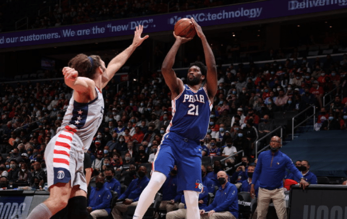 全场比赛,费城的5大首发球员得分全部上双,其中,恩比德36分创下生涯纪录,丹尼格林15分,哈里斯20分13板,西蒙斯14分9助5板,小库里15分6助。而奇才方面比尔25分,威少26分10助12板,但其余球员只有2人上双。全队三分命中率不足3成,在主场他们依然令人失望。