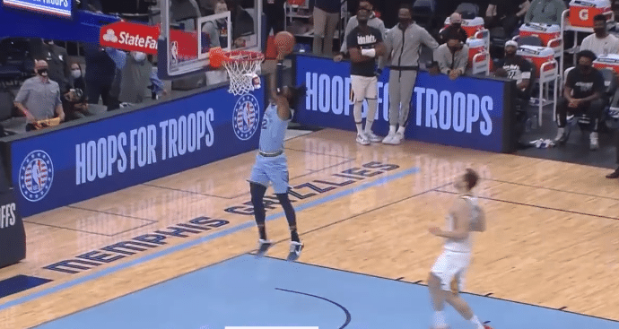 JRS直播网讯 今天灰熊回到主场迎战爵士,想要上演黑八奇迹,那么这两个主场对于灰熊是非常关键的。莫兰特和狄龙-布鲁克斯毫无疑问是灰熊能否取得胜利的关键,而今天的莫兰特也有不俗的发挥,他在上半场大秀超级拉杆上篮打进,还有反击360度暴扣点燃球迷激情,这位21岁的榜眼确实无处不在地体现着的自己的进攻才华。
