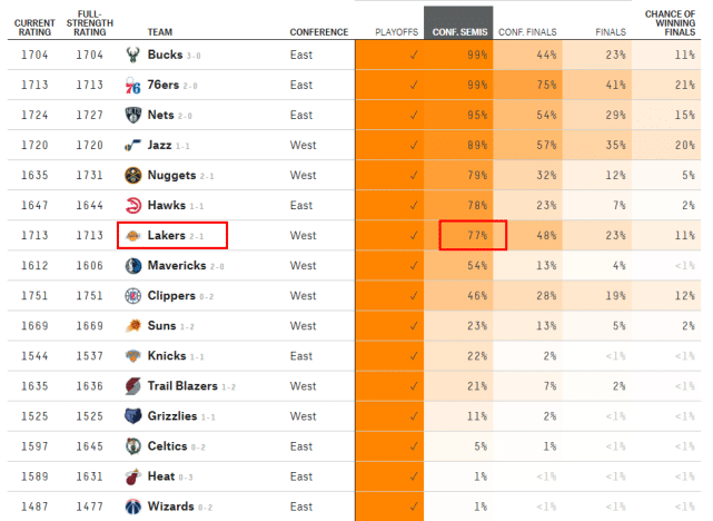 今天比赛过后,数据网站FiveThirtyEight也更新了各队晋级下一轮的最新概率:雄鹿(99%)和热火(1%),费城(99%)和奇才(1%),篮网(95%)和凯尔特人(5%),爵士(89%)和灰熊(11%),掘金(79%)和开拓者(21%),老鹰(78%)和尼克斯(22%),湖人(77%)和太阳(23%),独行侠(54%)和快船(46%)。