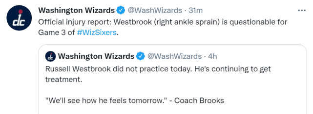 JRS直播网讯 北京时间5月29日,奇才官方宣布,威斯布鲁克(右脚踝扭伤)出战G3的状态是questionable(出战成疑,上场可能50%)。早些时候,奇才官方表示,威少没有参加今天的球队训练,他继续接受治疗。主帅布鲁克斯说:“我们要看看他明天的感觉。”