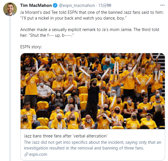 据ESPN名记麦克马洪报道,这三名被犹他爵士无限期禁赛的球迷对莫兰特的父母说了粗俗和种族主义的言论。