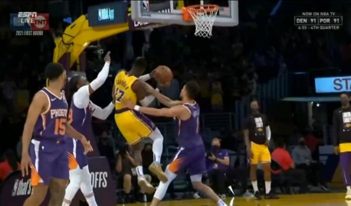 JRS直播网讯 北京时间5月28日,湖人主场109-95击败太阳,系列赛大比分2-1领先太阳,詹姆斯21分9助攻6篮板,第三节发力,晃倒对手后暴扣太狠;浓眉轰下34分11篮板,持续爆发;湖人双巨第三节合砍28分创纪录,比赛快结束时,布克恶犯遭驱逐,克劳德连吃两T也被驱逐。