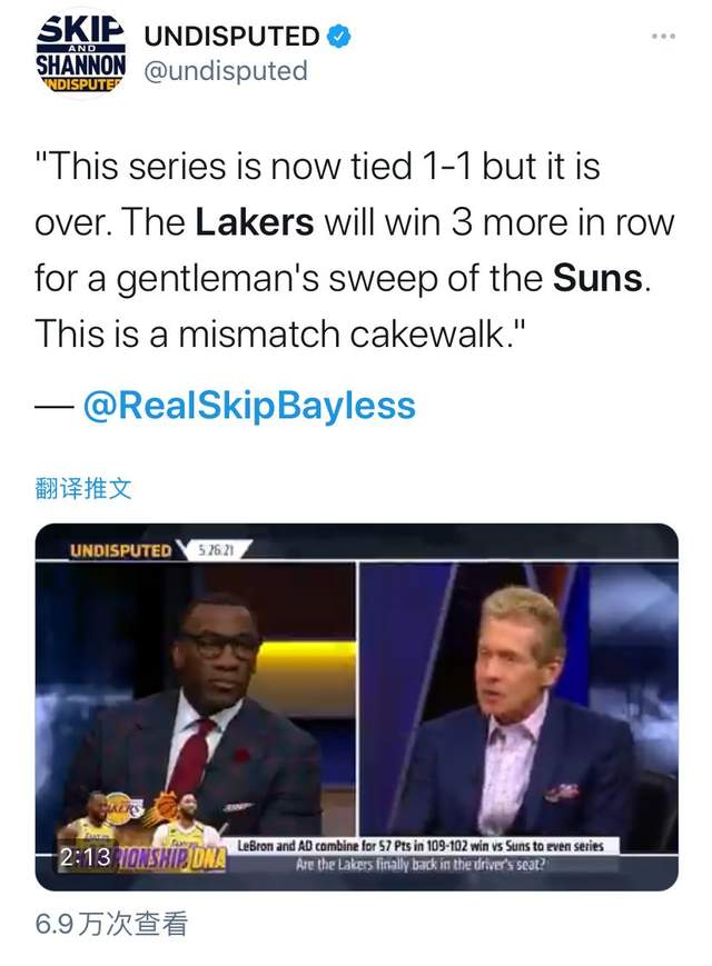 不熟悉这个Skip的朋友们可能不太清楚他的情况,其实他是美国当地著名的詹黑,他经常会在社交媒体上发布一些有关于詹姆斯的言论,而且每一次都是攻击詹姆斯。让人没想到的是他现在居然会说湖日大战已经结束了,而湖人可以连胜三场,这到底是什么原因呢?其实我们也可以来分析一下目前湖人和太阳之间的实力对比,再来看看为什么Skip会说出这种话。
