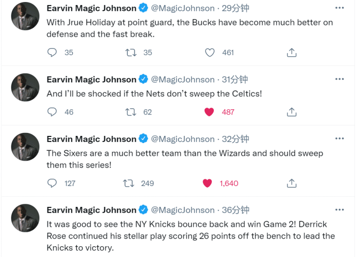 JRS直播网讯 北京时间5月27日,尼克斯主场击败老鹰扳回一城,76人则是大胜奇才将系列赛大比分改写为2比0!湖人名宿魔术师约翰逊向来喜欢在社媒上发表自己对比赛的看法。而就在刚刚,魔术师一下连发了7条推文!