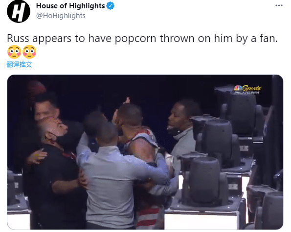 JRS直播网讯 北京时间5月27日,奇才和东部第一系列赛G2,场上多次出现受伤事件,末节威少脚踝受伤,一瘸一拐返回更衣室,离场时在球员通道入口处,威少被现场球迷激怒,情绪失控一副要揍人的样子,几个大汉才拦住他。