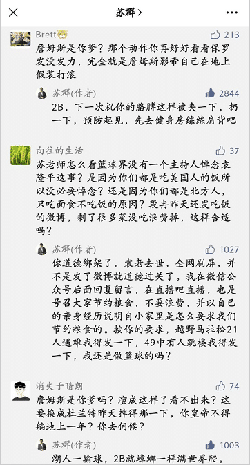 面对这么多的“詹黑”,苏群老师直接爆粗,称湖人一输球,2B就蟑螂满世界爬,还回应球迷称希望这名球迷的胳膊也被这样夹一下等等,苏群老师的情绪也是很激动的。