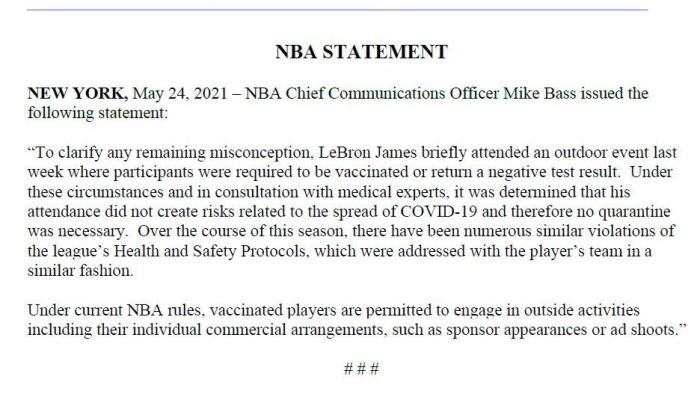 JRS直播网讯 北京时间5月25日,此前詹姆斯因参加私下活动而违反联盟防疫协议,不过联盟并没有让其禁赛;如今NBA官方针对这件事正式发表声明,解释为何詹姆斯没有被隔离,因为在场的人都接种疫苗或者检查结果呈阴性,专家认为这没有传播病毒的风险。