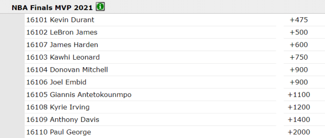 JRS直播网讯 北京时间5月24日,2020-21赛季的季后赛首轮才刚刚开打,但总决赛MVP的赔率竟然已经出炉!在这份FMVP赔率排名上,一共有32名球员在列。篮网球星杜兰特目前以+475的赔率位居第一,以微弱优势领先湖人球星詹姆斯(+500)。