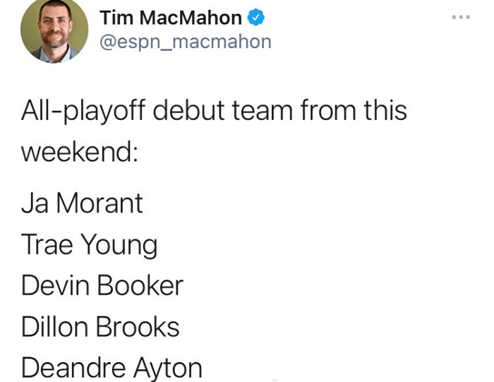 MacMahon在点评季后赛首轮的时候指出了首秀球员的最佳阵容,称莫兰特、特雷杨、布克、狄龙-布鲁克斯和艾顿;