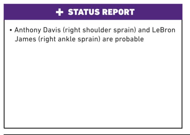 JRS直播网讯 北京时间5月23日,湖人官方公布了季后赛首战太阳的伤情报告,这份报告上只有詹姆斯和浓眉的名字。詹姆斯(右踝扭伤)、浓眉(右肩扭伤)的状态均为probable(大概率出战,上场可能性75%)。一般情况下,列为probable的球员基本都能上场,詹姆斯浓眉肯定不会错过季后赛的第一场。