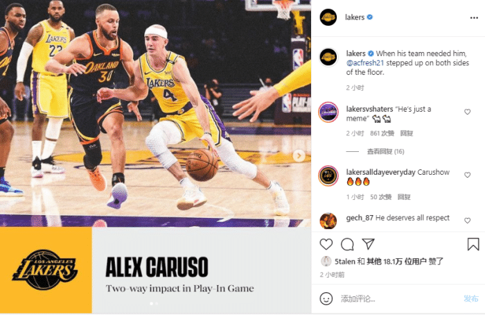 JRS直播网讯湖人官方晒出卡鲁索在附加赛中的表现,配文:当球队需要他的时候,卡鲁索在攻防两端都表现很好;对此詹姆斯转发并且盛赞小弟:历史最佳。