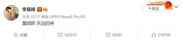 李易峰也是资深的NBA球迷了,最早的时候他就是科比的粉丝,曾主动请求采访科比,在18年季后赛他又被灭霸詹所折服,成为了詹姆斯的粉丝。老詹加盟湖人之后,他还去过斯台普斯中心为湖人加油,在去年总决赛湖人拿到总冠军后,李易峰就发文祝贺湖人夺冠,感谢詹姆斯。这次老詹的三分也让湖人起死回生,峰哥发博赞叹:“詹姆斯,永远的神。”永远的神这个词来源自电竞圈,表示一个选手在关键比赛的超神发挥,用来形容这场的詹姆斯再合适不过了。值得一提的是:陈冠希也是詹姆斯的粉丝,难道他也会点赞这条微博吗?