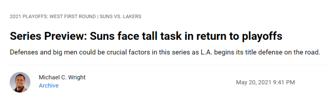 官网直言,在一轮系列赛里,7号种子比2号种子更被看好,确实有点奇怪。詹姆斯表示:“湖人是上赛季的总冠军,因此每支球队都想击败我们,我们得知道这一点,对太阳的系列赛我们要打得比现在更好一些。”官网预测湖人6战胜出。