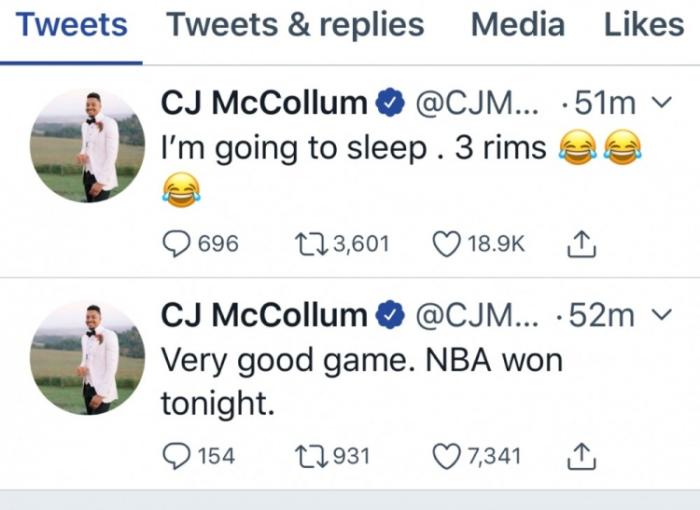 遭遇如此的犯规,如果放在麦科勒姆的身上,或许这哥们就要伤退,这哥们就会喊疼,可是到了詹姆斯身上却成为了演员,不得不说麦科勒姆这双标666。当然这还不是全部,当詹姆斯在赛后谈到什么能够投进制胜三分球时,詹姆斯调侃的因为被格林戳到眼睛,我看到三个篮筐,我选择了中间的言语,也成为了麦科勒姆调侃的契机,在入睡前,麦科勒姆在社交媒体上表示:今晚是NBA赢了,我去睡觉了三个篮筐。