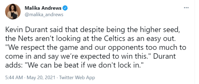 杜兰特在采访时也称赞了绿军,并指出就算失去杰伦-布朗,他们还有富尼耶、普理查德、汤普森、沃克这些优秀的球员。大战即将开启,杜兰特也提醒全队:“如果我们不够专注,我们也会输球。”