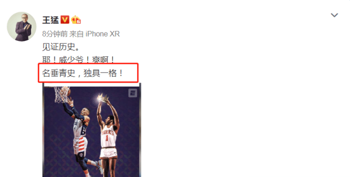 而王猛老师感慨,见证历史。“见证历史,韦少爷名垂青史,独具一格”。而雷霆官方也发文祝贺韦少。