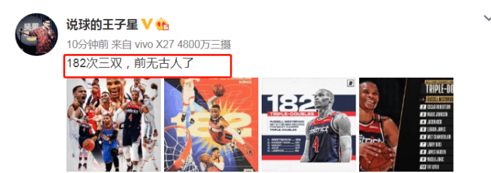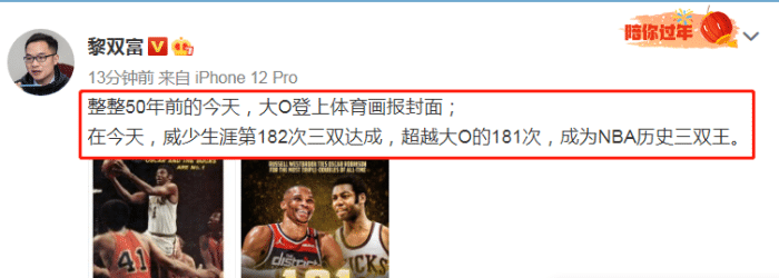 国内篮球名嘴们纷纷向韦少道贺。知名体育媒体人黎双富表示,“整整50年前的今天,大O登上体育画报封面,在今天,韦少生涯第182次三双达成,超越大O的181次,成为NBA历史三双王”。