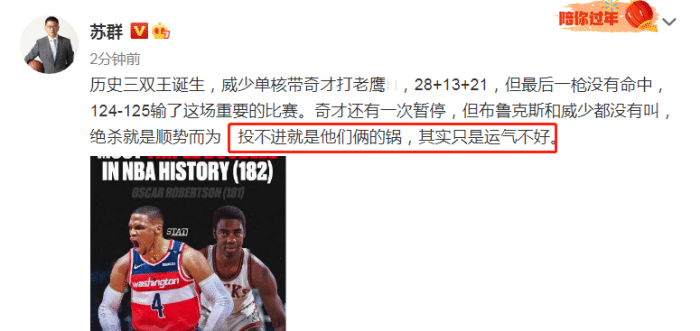 苏群老师则分析了比赛,“奇才还有一次暂停,但布鲁克斯和韦少都没有叫,绝杀就是顺势而为,投不进就是他们俩的锅,只是运气不好”。投进了是英雄,投不进就要背锅,这就是NBA。