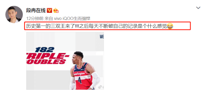 而段冉老师的这番话很有趣,“历史第一的三双王来了,之后每天不断破自己的纪录,这是个什么感觉”。
